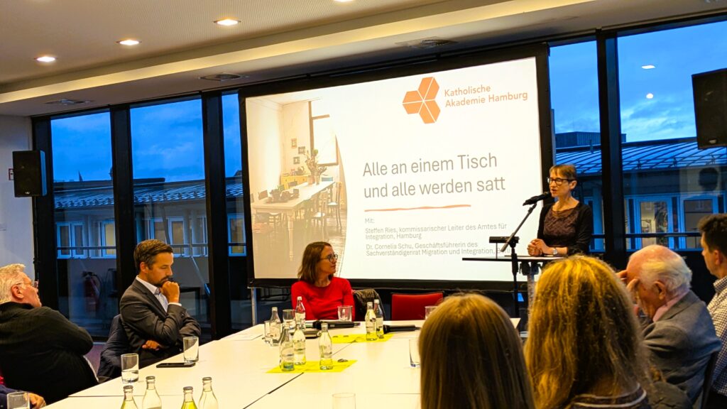 Dr. Cornelia Schu wurde von der Katholischen Akademie Hamburg eingeladen, als Expertin für Integrationsfragen an der Veranstaltung „Alle an einem Tisch und alle werden satt“ teilzunehmen. Die Veranstaltung ging der Frage nach, wie Deutschland als eine zunehmend (super)diverse Gesellschaft die Zugänge zu Ressourcen so gestalten kann, dass diese möglichst gerecht verteilt werden. In einem Impulsvortrag stellte die Geschäftsführerin des SVR Stand, Ziele und mögliche Zielkonflikte der Integration in der Einwanderungsgesellschaft Deutschland vor. Dabei ging sie auf Bildungschancen von Kindern mit Migrationshintergrund ein, beleuchtete Aspekte der Arbeitsmarktbeteiligung Geflüchteter und teilte empirische Ergebnisse aus dem SVR-Integrationsbarometer zu Einstellungen gegenüber Integration und Migration in der Bevölkerung.